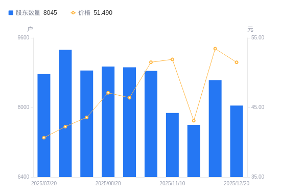 近一年(2024年12月20日至2025年12月10日),和林微纳A股股东户数从7241户,增加至8630户,增幅19.18%,区间股价上涨98.24%。