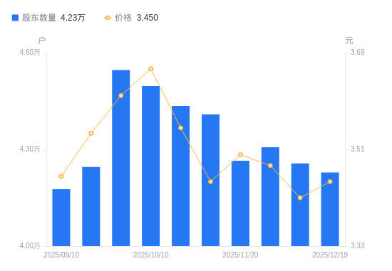 近一年(2024年12月20日至2025年12月19日),阳光照明A股股东户数从3.85万户,增加至4.23万户,增幅9.92%,区间股价上涨5.83%。