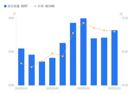 近一年(2024年12月20日至2025年12月20日),日联科技A股股东户数从7103户,增加至9257户,增幅30.33%,区间股价上涨79.78%。