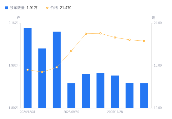 近一年(2024年12月31日至2025年12月19日),朗坤科技A股股东户数从2.14万户,减低至1.91万户,降幅10.95%,区间股价上涨20.75%。