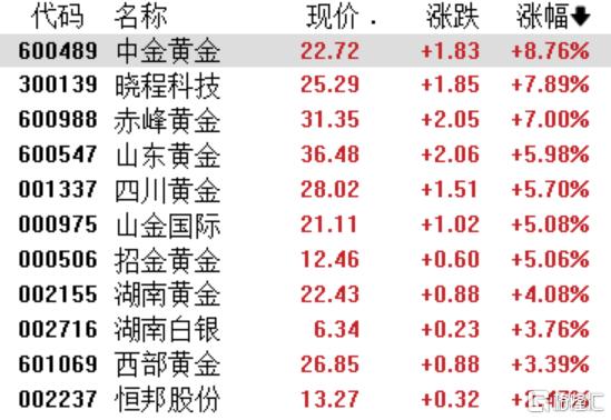 贵金属板块涨幅靠前,中金黄金涨超8%,晓程科技、赤峰黄金涨超7%,山东黄金、四川黄金、山金国际、招金矿业涨超5%。