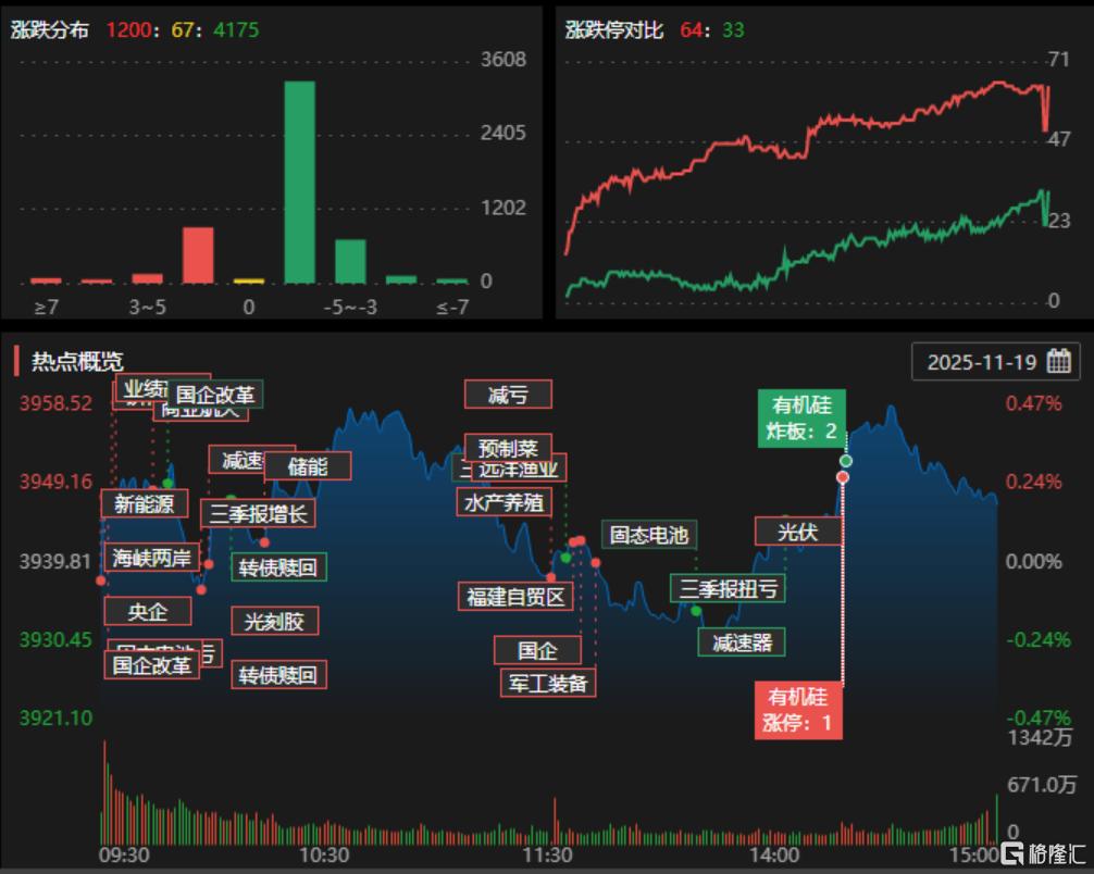 11月19日,A股三大指数小幅震荡,沪指、创业板指均收红。截至收盘,沪指涨0.18%报3946点,深证成指平收,创业板指涨0.25%。全市场成交额1.74万亿元,近4200股下跌。