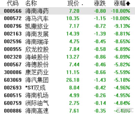 海南自贸区板块全线调整,海南海药、海马汽车触及跌停,凯撒旅业(维权)跌超9%,海南发展、海南瑞泽跌超8%。