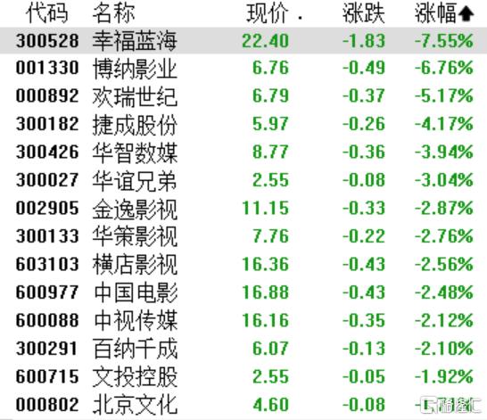 影视院线板块普跌,幸福蓝海跌超7%,博纳影业跌超6%,欢瑞世纪跌超5%,华谊兄弟、金逸影视、华策影视、横店影视纷纷下跌。