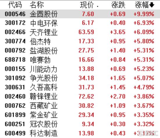 锂矿板块冲高震荡,金圆股份(维权)涨停,天齐锂业涨超6%,盐湖股份、川能动力涨超5%,久吾高科、赣锋锂业、西藏矿业、科达制造纷纷上涨。消息面上,碳酸锂期货主力合约强势突破10万元大关,主力合约涨近6%,创2024年6月以来新高。今年11月以来碳酸锂主力期货合约价格累计上涨近两成,今年全年累计涨幅超过30%。