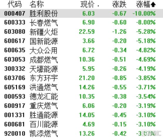 燃气板块表现较弱,胜利股份触及跌停,长春燃气跌8%,新疆火炬、国新能源跌超5%,大众公用、成都燃气、洪通燃气、重庆燃气跟跌。