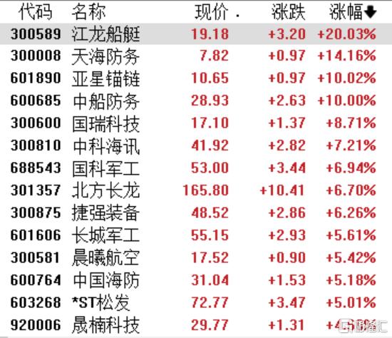 军工装备板块走强,江龙船艇20CM涨停,天海防务涨超14%,亚星锚链、中船防务10CM,中科海讯、国瑞科技、北方长龙跟涨。