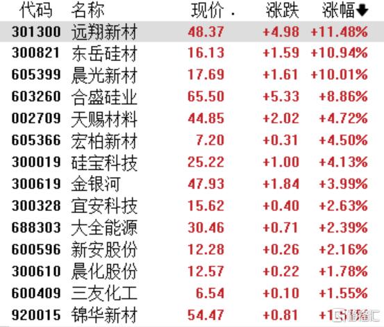 有机硅板块午后拉升,远翔新材涨超11%,东岳硅材涨超10%,晨光新材涨停,合盛硅业涨超8%,宏柏新材、硅宝科技涨超4%。消息面上,多晶硅主力合约震荡走高,日内涨超3%,现报54040元/吨。工业硅主力合约涨幅再度扩大,日内涨幅达5.13%,现报9435元/吨。