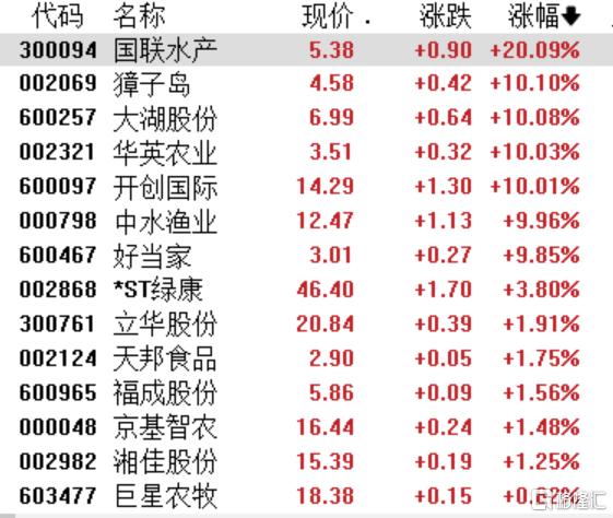 养殖业板块表现活跃,国联水产20CM涨停,獐子岛、大湖股份、中水渔业10CM涨停。