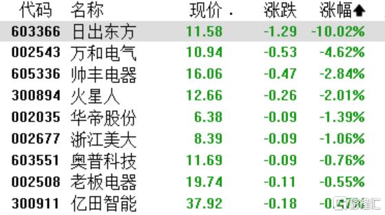 厨卫电器板块飘绿,日出东方跌停,万和电气跌4.62%,帅丰电器、火星人跌超2%,华帝股份、浙江美大跌超1%。