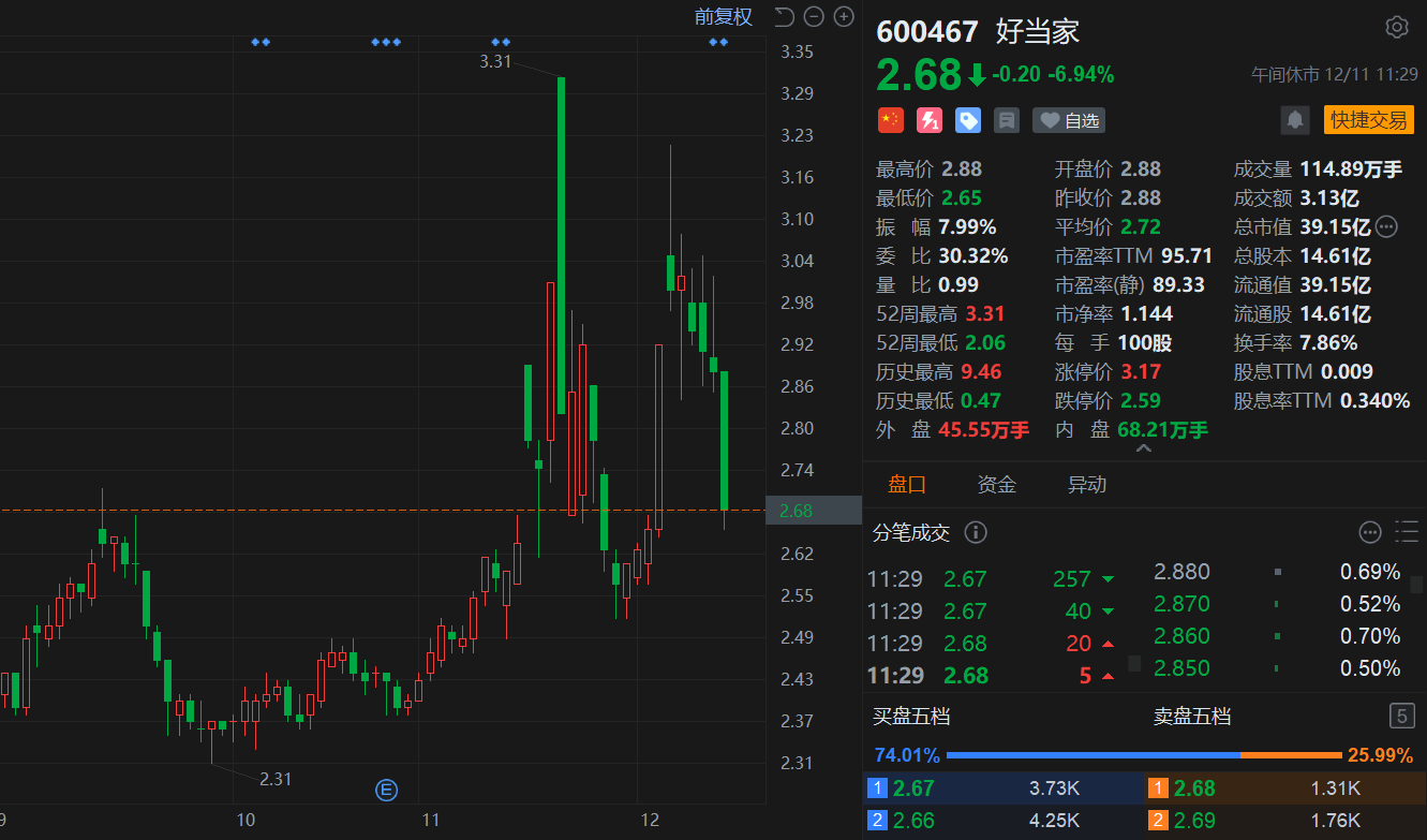 好当家(600467.SH)大幅下跌7%,报2.68元,总市值跌破40亿元关口。消息上,好当家昨日盘后公布,好当家集团于2025年12月5日至2025年12月10日,通过大宗交易方式减持公司股份1224.59万股,占好当家股份总数的0.84%。本次减持后,股东好当家集团权益变动触及1%刻度。