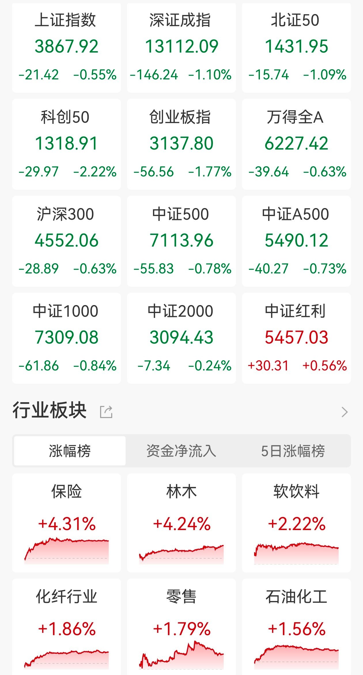 A股三大指数今日集体走低,截至收盘,沪指跌0.55%报3867.92点,深证成指跌1.1%,创业板指跌1.77%,科创50指数跌2.22%。全市场成交额1.79万亿元,较前一交易日缩量3246亿元,超2900股下跌。