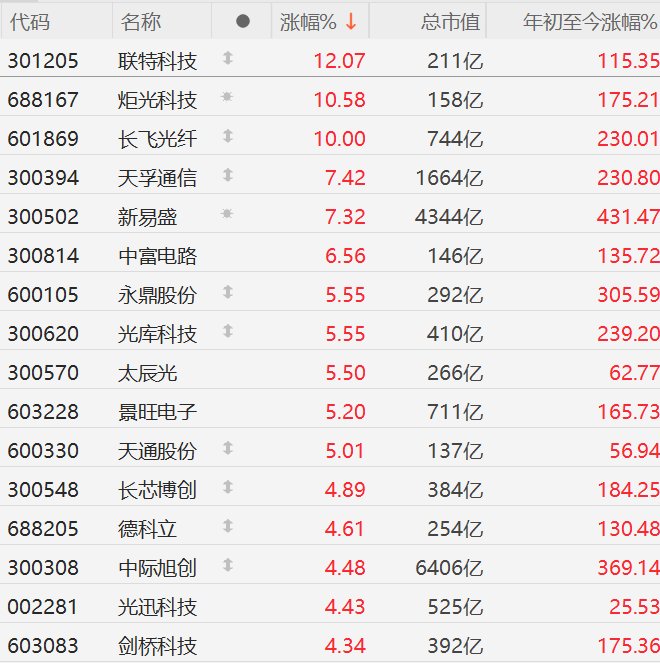 格隆汇12月17日|A股市场CPO概念股走强,其中,联特科技涨超12%,炬光科技涨超10%,长飞光纤10CM涨停,天孚通信、新易盛涨超7%,中富电路涨超6%,永鼎股份、光库科技、太辰光、景旺电子、天通股份涨超5%,长芯博创、德科立、中际旭创、光迅科技、剑桥科技涨超4%。