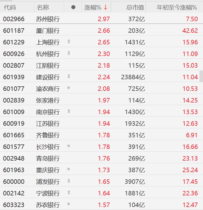 格隆汇12月18日|A股市场银行股普涨,其中,苏州银行、厦门银行、上海银行、杭州银行、江阴银行、建设银行、渝农商行涨超2%。张家港行、南京银行、江苏银行、齐鲁银行、长沙银行、青岛银行、重庆银行涨近2%。