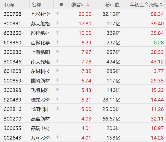 格隆汇1月15日|A股市场光刻胶概念股拉升,其中,七彩化学(维权)20CM涨停,苏大维格(维权)涨超12%,彤程新材10CM涨停,百傲化学涨超8%,上海新阳(维权)、南大光电、东材科技涨超7%,国风新材、飞凯材料(维权)、佳先股份(维权)涨超5%。