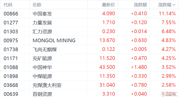 煤炭股上涨,中国秦发涨11.14%,兖矿能源涨4.25%,中国神华涨3.52%,中煤能源、兖煤澳大利亚涨超2%。