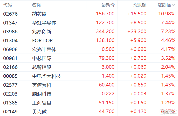 半导体股集体上涨,纳芯微涨近11%,华虹半导体、兆易创新涨超7%,宏光半导体涨超4%,中芯国际、芯智控股、上海复旦跟涨。