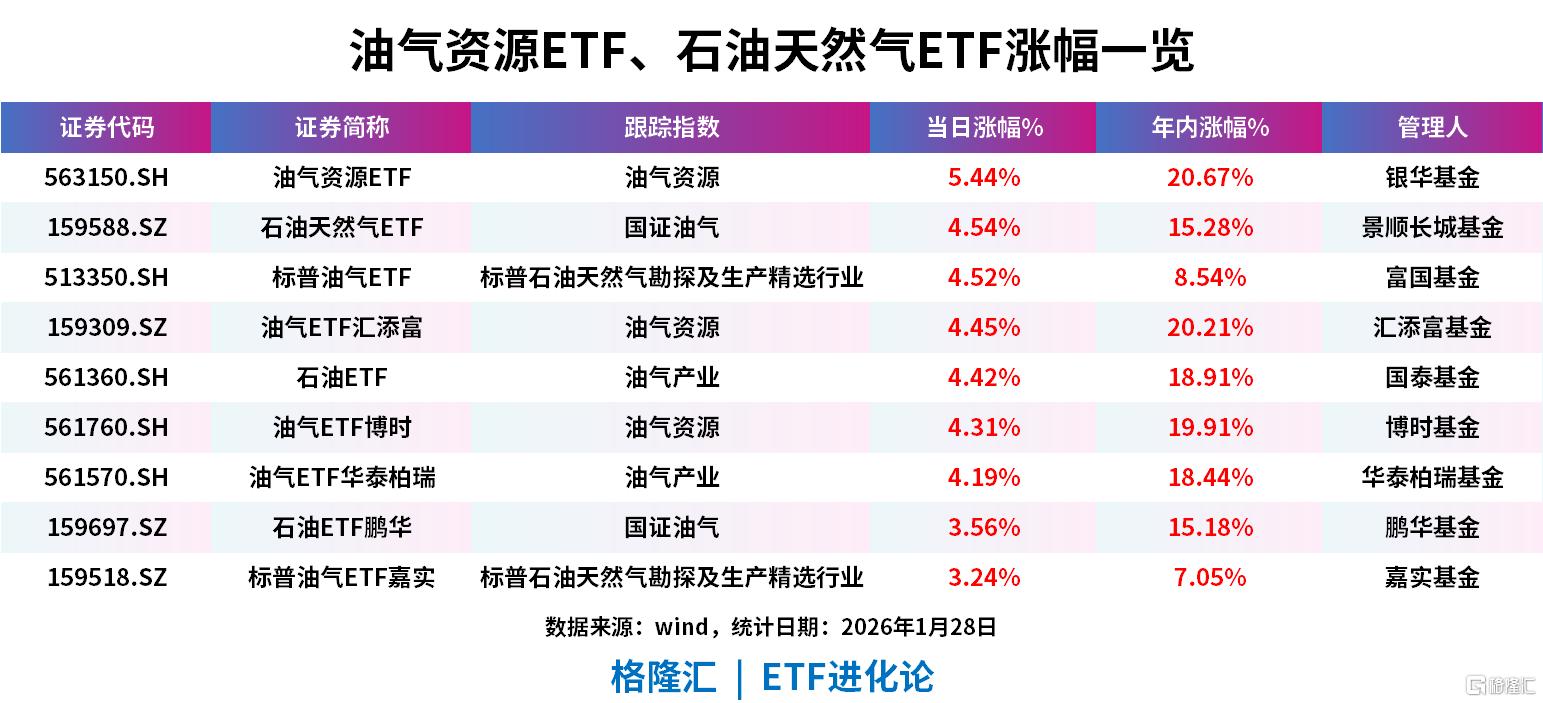 石油股涨势上涨,油气资源ETF、石油天然气ETF涨超5%;标普油气ETF、油气ETF汇添富、石油ETF、油气ETF博时、油气ETF华泰柏瑞涨超4%;石油ETF鹏华、标普油气ETF嘉实涨超3%。