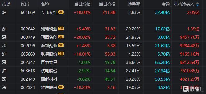 龙虎榜中涉及机构专用席位的个股中,当日净买入额前三为巨力索具、杭电股份、西部材料,分别为8212.64万元、7610.85万元、4821.27万元。