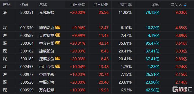 龙虎榜单日净买入额前三为光线传媒、捷成股份、中国电影,分别为9.03亿元、3.03亿元、2.15亿元。