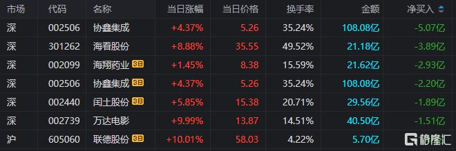 龙虎榜单日净卖出额前三为协鑫集成、海看股份、万达电影,分别为5.07亿元、3.89亿元、1.51亿元。