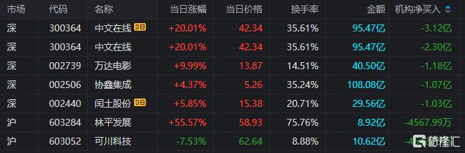 中文在线:今日斩获2连板,成交额95.47亿元,换手率35.61%,盘后龙虎榜数据显示,深股通专用席位买入2.66亿元并卖出5.62亿元,1家机构专用席位净买入715.79万元,有2家机构专用席位净卖出2.37亿元。