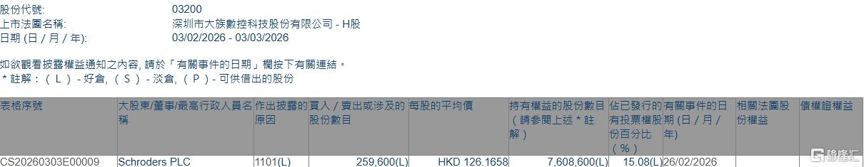 格隆汇3月3日丨根据联交所最新权益披露资料显示,2026年2月26日,大族数控(03200.HK)获Schroders PLC在场内以每股均价126.1658港元增持25.96万股,涉资约3275.26万港元。