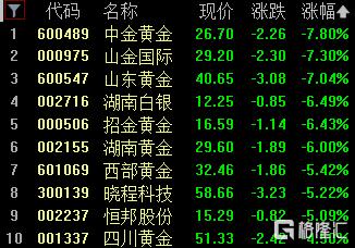 贵金属板块大跌,中金黄金、山金国际、山东黄金跌超7%,湖南白银、招金黄金跌超6%。