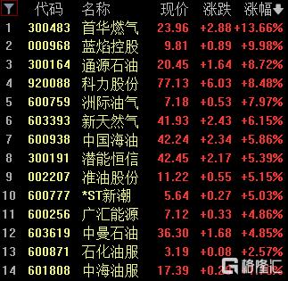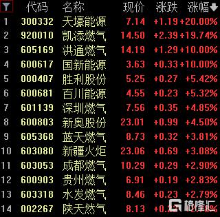 燃气板块走高,天壕能源20cm涨停,凯添燃气涨超19%,洪通燃气、国新能源涨停。