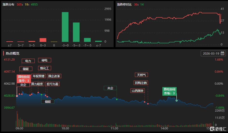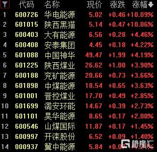 煤炭开采及加工板块涨幅居前,华电能源、陕西黑猫涨停,大有能源、安泰集团、中国神华涨超4%。