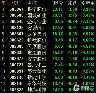 钛白粉板块走低,振华股份跌停,国城矿业(维权)跌超8%,金浦钛业跌超6%,安纳达跌超5%。