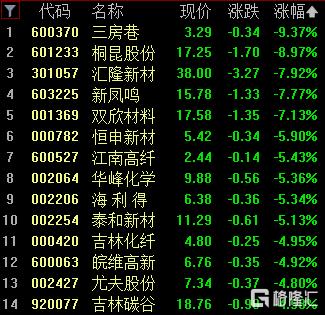 化学纤维板块跌幅居前,三房巷跌超9%,桐昆股份跌近9%,汇隆新材、新凤鸣、双欣材料跌超8%。