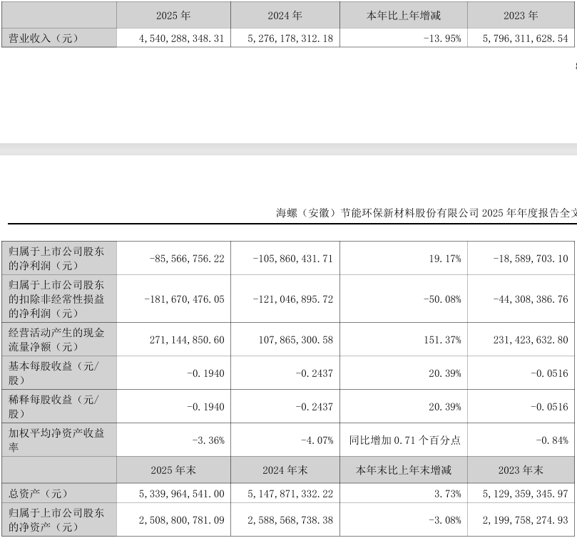 3月28日,海螺新材发布2025年年报。报告显示,公司2025年营业收入为45.40亿元,同比下降13.95%;归母净利润为-8556.68万元,同比增长19.17%;扣非归母净利润为-1.82亿元,同比下降50.08%;基本每股收益-0.19元。