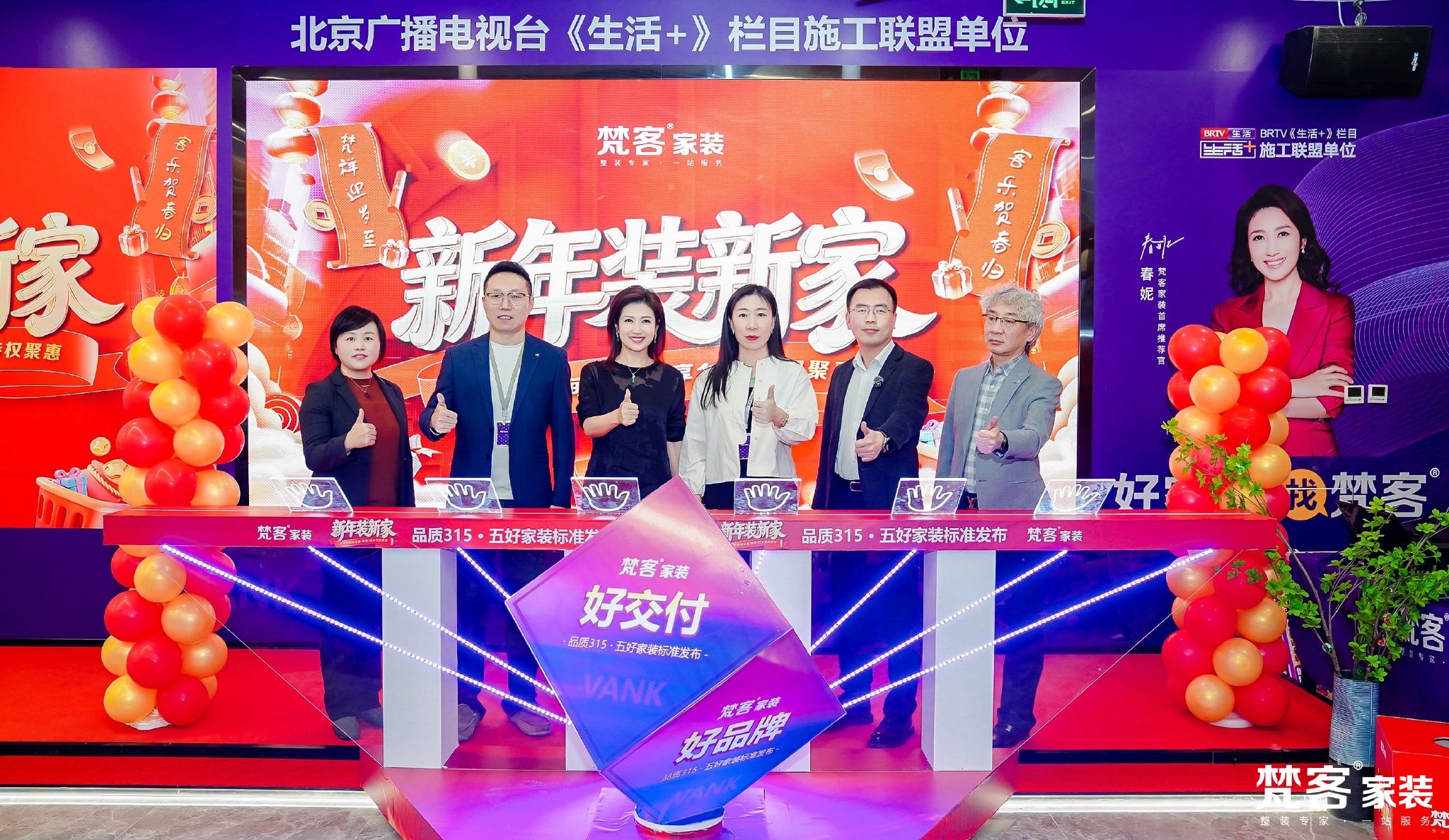 活动的最后,梵客集团副总裁/梵客家装总经理任琳、梵客集团CMO张栋、北京远东神华集团副总裁孙凯、海尔电器国朗博实总经理李国品、北京马可波罗瓷砖家装渠道总监杨粉英,以及著名主持人/梵客家装首席推荐官春妮老师走上台,共同开启了梵客“五好家装标准”的发布启动仪式,并点亮象征信任、品质与服务的能量之光!