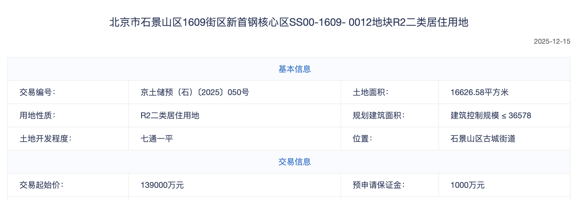 纯居住用地,规划建面约3.66万㎡,交易起始价13.9亿元,折合楼面价3.8万元/㎡。