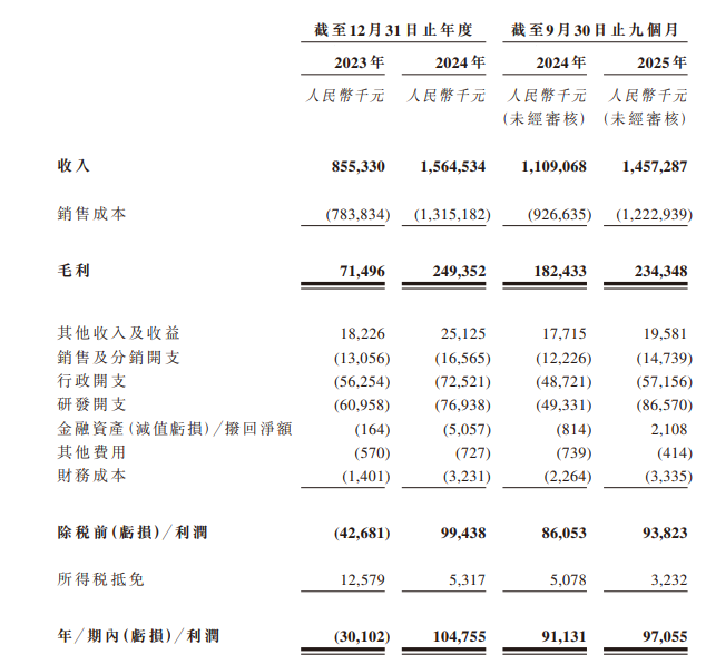 业绩方面,2023年至2024年及2025年前三季度(下称“报告期”),公司收入分别为8.55亿元、15.65亿元及14.57亿元;利润分别为-3010.2万元、1.05亿元及9705.5万元。