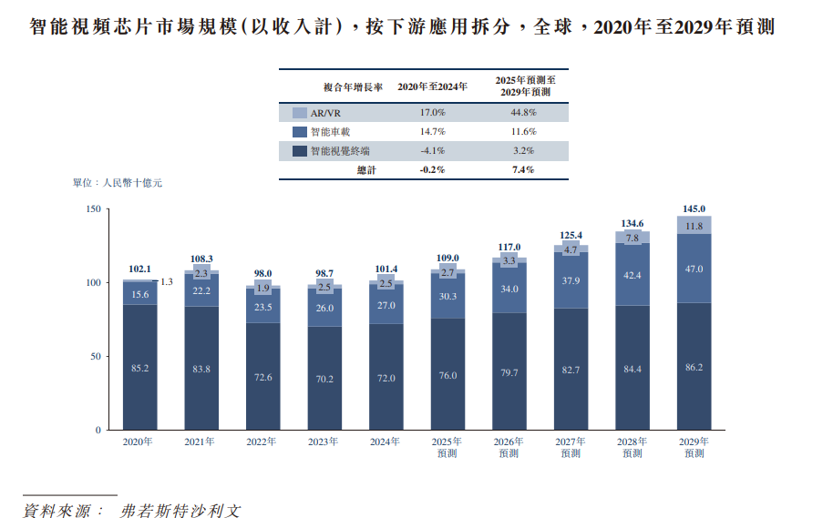 智能视频芯片正持续推动显示性能与交互体验的升级,成为推动终端设备创新与性能提升的重要引擎。在2020年至2024年期间,全球市场规模从人民币1,021亿元小幅下降至人民币1,014亿元,这主要由于下游应用行业周期性波动所致。在2022年至2023年间,智能视觉终端等下游领域出货量显著下降,从而使得整体智能视频芯片的市场需求同步回落。在2024年,随着经济复苏与下游周期逐步缓解,整体智能视频芯片需求逐步回升。未来,AR/VR、智能车载及智能终端设备升级将驱动智能视频芯片市场规模快速增长,预计将以7.4%的复合年增长率从2025年的人民币1090亿元增长至2029年的人民币1450亿元。