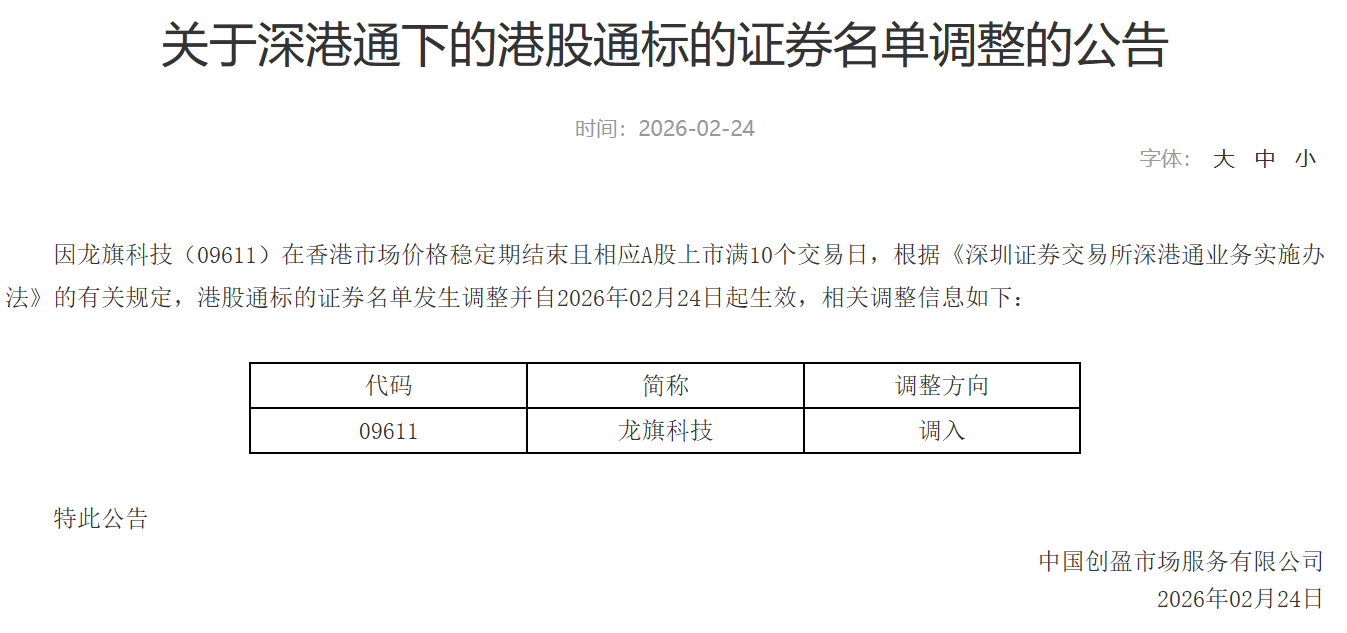 2月24日,深圳证券交易所发布《关于深港通下的港股通标的证券名单调整的公告》。因龙旗科技(09611)在香港市场价格稳定期结束且相应A股上市满10个交易日,根据《深圳证券交易所深港通业务实施办法》的有关规定,将龙旗科技调入深港通下的港股通标的,相关调整自2026年02月24日起生效。