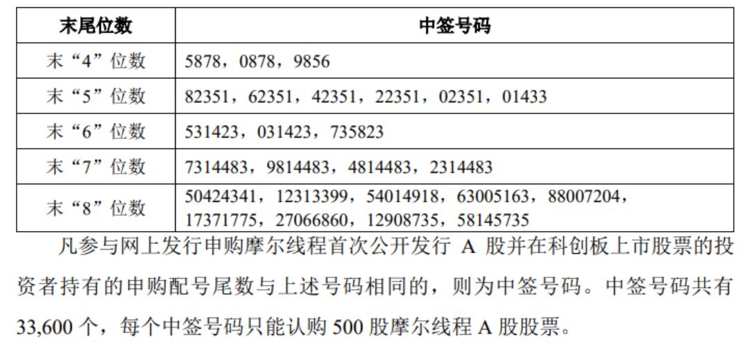摩尔线程发布首次公开发行股票并在科创板上市网下初步配售结果及网上中签结果公告,本次发行战略配售的缴款及配售工作已结束,本次发行最终战略配售结果如下。中签号码共有33600个,每个中签号码只能认购500股摩尔线程A股股票,中签结果如下。