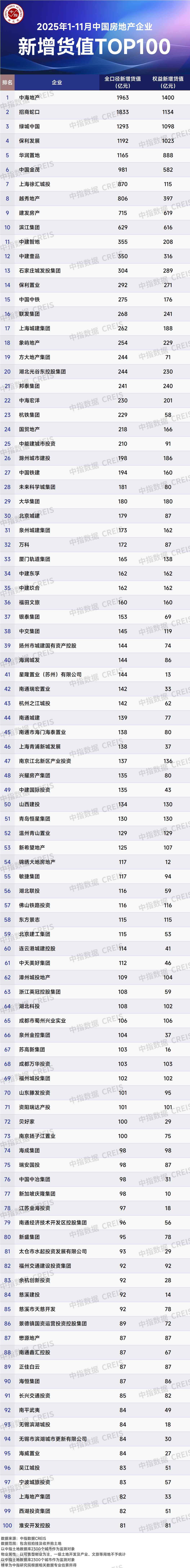 数据来源:中指数据 数据范围:包含招拍挂权益土地及收并购土地从新增货值来看,中海地产、招商蛇口和绿城中国位列前三。2025年1-11月,中海地产以1963亿元新增货值位列第一,招商蛇口(001979.SZ)新增货值规模为1833亿元,位列第二,两家企业均通过获取上海城市更新项目,货值大幅提升。绿城中国(03900)新增货值规模为1293亿元,位列第三。TOP10企业2025年1-11月新增货值总额11446亿元,占TOP100企业的47.1%,新增货值门槛跃升至81亿元。