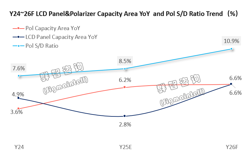 2026年全球偏光片产能依然处于重整中,产能增速减缓。而需求端,在LCD TV面板大尺寸化带动下偏光片需求面积持续增长,群智咨询(Sigmaintell)预计2026年全球LCD 面板用偏光片的供需比为10.9%,供需处于动态平衡,LCD面板用偏光片的价格有望趋于相对稳定。