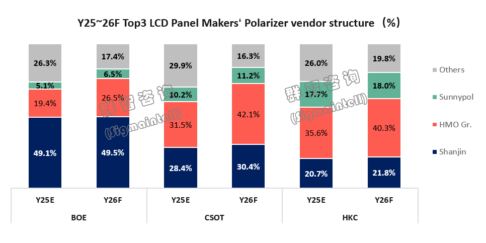 京东方(BOE):与杉金光电战略合作。2025年LCD面板用偏光片需求中杉金光电占比接近50%,预计2026年将维持约五成的份额。在偏光片供应方面,京东方得到杉金光电的最优保障,以及产品研发方面的高度协同,共同开发了STW高端面板用偏光片,对京东方的高端品形成了加持和保障。随着恒美与SDI业务交割完成,预计2026年恒美集团在BOE内部的偏光片占比也将进一步提升到超20%的水平,成为京东方LCD 面板用偏光片的第二大供应商。头部两家偏光片厂商供应份额超七成,偏光片供应走向更集中。