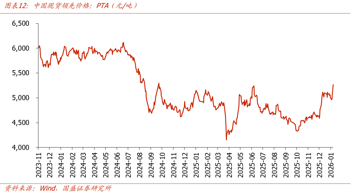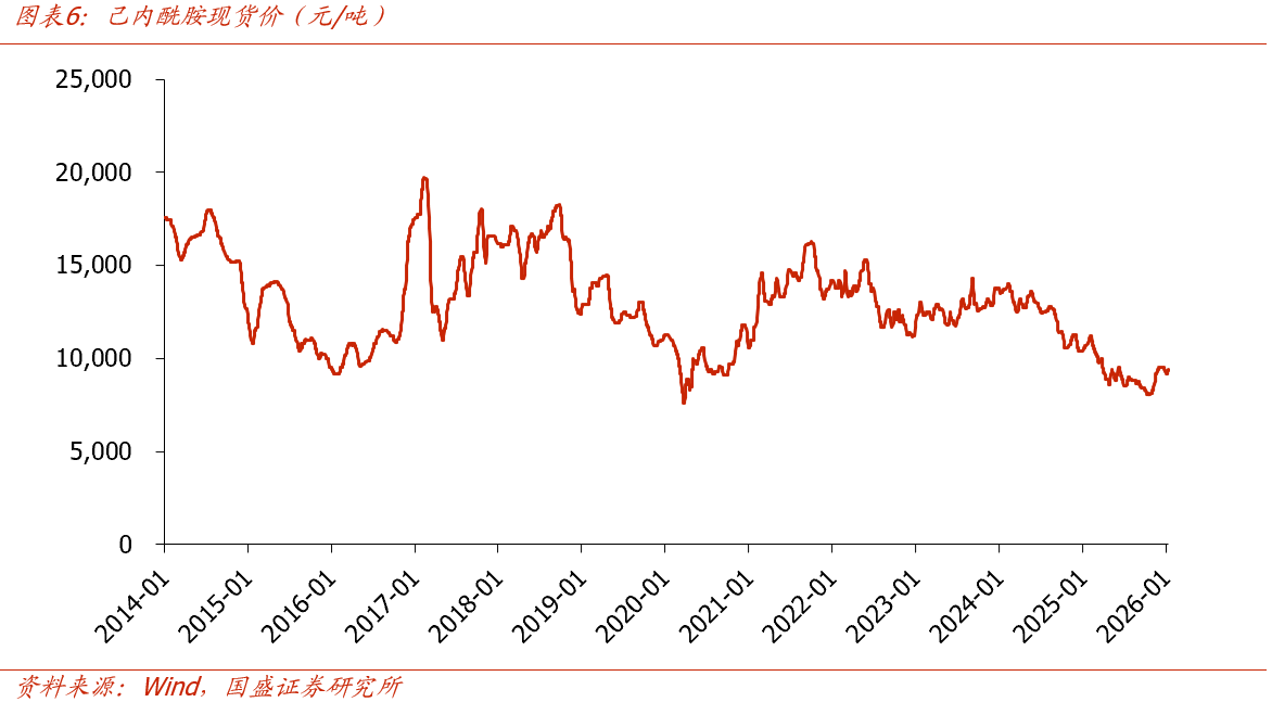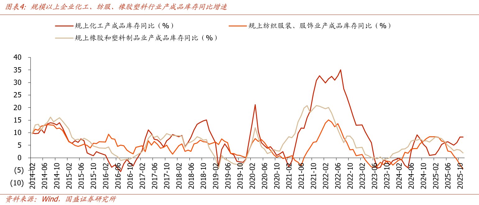 从库存周期看,化工行业可能正处于主动去库向被动去库切换的临界点。尽管2025H2受需求偏弱影响,化工原料及制品行业库存同比出现小幅回升(11月底同比+8.3%),但下游主要终端(纺织服装、橡胶制品)产成品库存增速自2025年3月以来持续下行,产业链库存剪刀差已较大。化工产业链呈现出上游温和库存+下游低库存结构,后续一旦需求改善,下游补库需求有望触发上游化工品快速去库,现货偏紧情况下有望为价格弹性提供强力支撑。