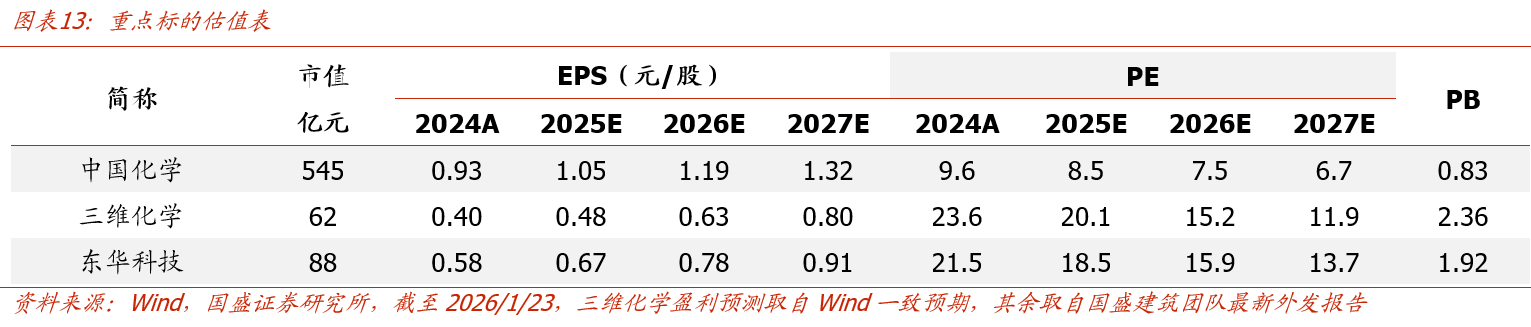 站在2026年伊始,我们认为化工产品价格上涨具备动能:1)供给端在行业资本开支下行,叠加环保限产和部分化工企业因成本劣势关停背景下,竞争格局持续改善;2)需求端从制造业PMI数据已可见改善信号;3)库存周期上呈现出上游温和库存+下游低库存结构,后续下游补库需求有望触发上游化工品快速去库;4)反内卷政策导向下,龙头企业开始积极带领行业降低负荷率来挺价。近年来部分建筑企业通过积极运用产业链优势延伸至化工实业领域,后续有望受益相关化工品涨价,重点推荐和关注:中国化学(己二腈年产能20万吨,己内酰胺年产能20万吨,26PE 7.5X),三维化学(醛/醇/酸/酯类产品产能分别为17/26/3/10万吨/年,26PE 15X),东华科技(6万吨/年PBAT、4万吨/年PBT和内蒙新材30万吨/煤制乙二醇项目已正式投产,26PE 16X),东南网架(涤纶长丝年产能50万吨)。