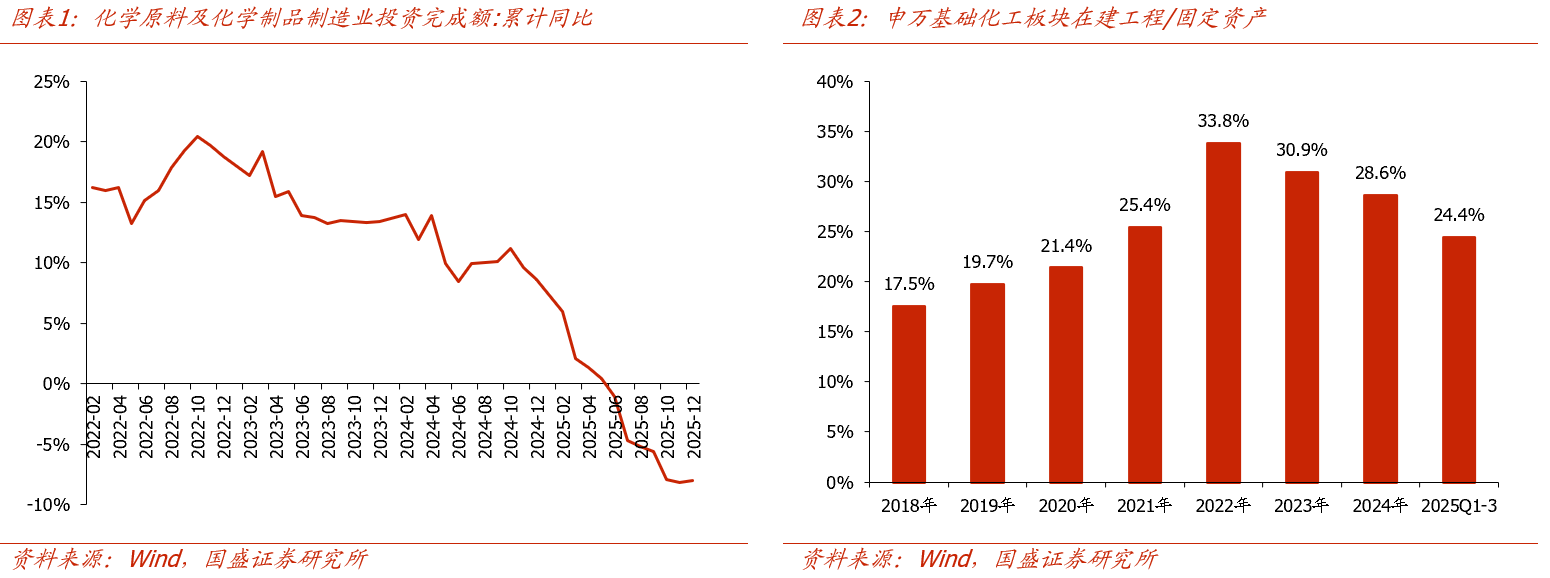供需格局改善,“反内卷”背景下,化工品有望迎来涨价。从供给端看,化学原料及化学制品制造业投资增速自2022年以来持续回落,2025年6月投资增速由正转负,申万基础化工板块在建工程/固定资产从2022年的峰值33.8%持续回落至2025Q1-3的24.4%。考虑到化工行业产能建设周期一般为3年左右,随着资本开支大幅下行,当前我国化工行业新增产能投放已明显减少。除新增产能减少之外,受能耗双控、2025年深化环保政策影响,以及欧洲、日韩化工装置因成本劣势在2025年出现的大规模关停(特别是乙烯、丙烯等基础化工原料),部分化工行业老旧产能在加速退出,全球供给格局已有所改善。