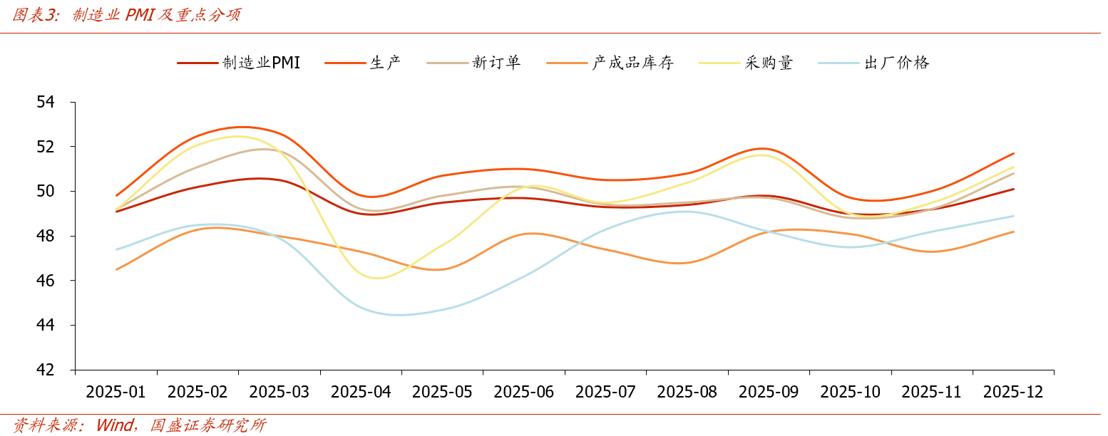 从需求端看,当前虽然传统需求偏弱,但受制造业补库、春节前备货、出口增多、以及新型制造需求增长影响,部分化工品需求具备较强支撑。从数据上看,2025年12月制造业PMI为50.1%,自2025年4月份以来首次回到扩张区间,其中生产与新订单分项同步回升,显示制造业需求正边际改善。