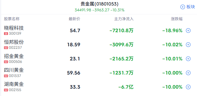 贵金属、小金属等有色板块大面积走低,湖南白银、西部黄金、四川黄金等成分股大面积跌停。