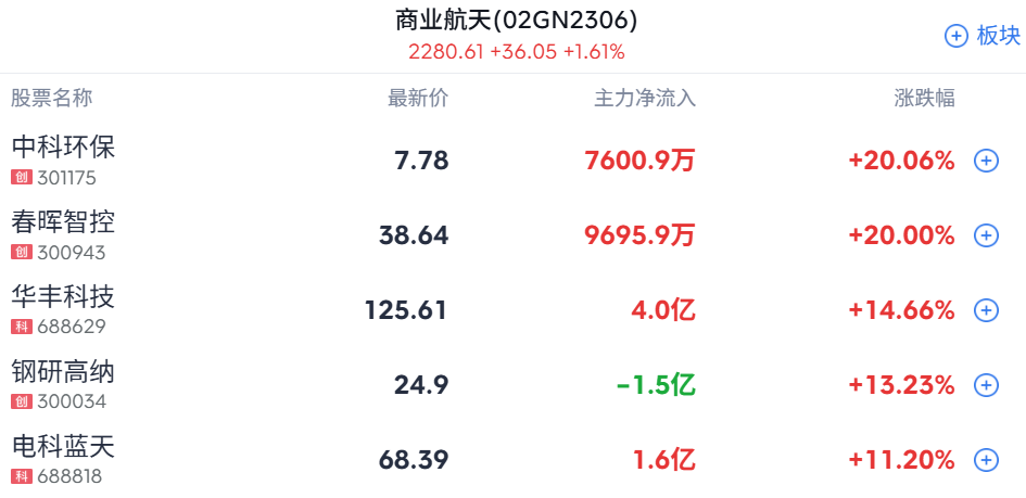 商业航天概念持续上行,航天动力回封涨停,广联航空、航宇科技、西部材料、航天环宇、上海港湾、电科蓝天跟涨。