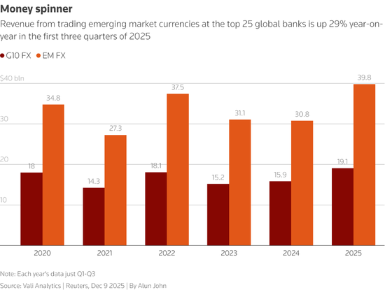 Vali Analytics为路透社整理的数据显示,新兴市场货币交易已成为银行的盈利利器。今年前九个月,全球前25大银行通过此类交易斩获近400亿美元收入,创下历史最佳业绩。该数据公司的分析还显示,这一收入规模是这些银行从十国集团货币交易中获利的两倍多,十国集团货币涵盖美元、英镑、欧元等主要币种。