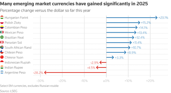 墨西哥比索与巴西雷亚尔同样跻身今年表现最佳的新兴市场货币行列。这些国家的央行政策稳健,利率处于高位,其中巴西的基准利率更是达到15%,创下20年来的新高。此外,两国的货币与债券市场准入门槛较低,易于投资者参与。